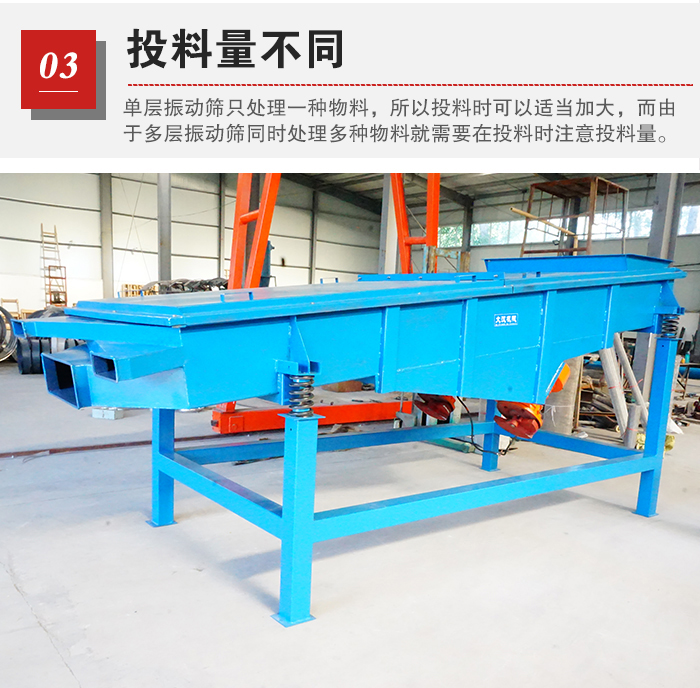 物料的篩分能力是由投料的大小有著直接關(guān)系的,由于單層振動(dòng)篩只處理一種物料,所以投料時(shí)可以適當(dāng)加大,而由于多層振動(dòng)篩同時(shí)處理多種物料就需要在投料時(shí)注意投料量。