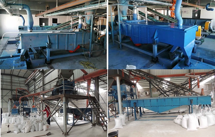 塑料顆粒通過輸送帶進(jìn)入多層直線篩設(shè)備,由于電機(jī)激振力和自身重力的雙重作用,塑料顆粒沿直線篩面直線跳躍,上層塑料顆粒在上排料口被篩出,而小于篩網(wǎng)目數(shù)的塑料顆粒進(jìn)入下部篩網(wǎng),仍沿同一物料運(yùn)動(dòng)軌跡。經(jīng)過三層篩網(wǎng)后,塑料顆粒分為大于2.5mm塑料顆粒、2.5mm-1.4mm塑料顆粒、1.4mm-80目塑料顆粒、小于80目塑料顆粒等四種規(guī)格的材料,還可根據(jù)要求選擇6層不通目數(shù)的篩網(wǎng),以實(shí)現(xiàn)要求的分級(jí)效果。