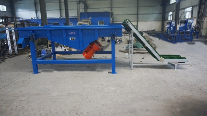 破碎機 + 振動篩:廢舊輪胎經破碎機撕裂、破碎成橡膠塊后,由輸送帶送入振動篩,通過粗篩網(wǎng)分離出未破碎完全的大塊橡膠與雜質,合格橡膠塊進入下一道工序。