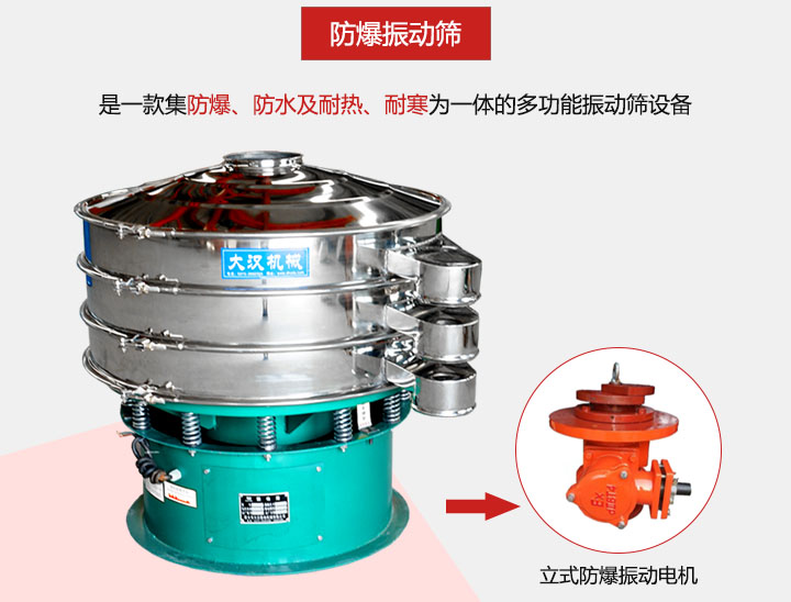 防爆振動篩是針對一些易產(chǎn)生爆炸行業(yè)的研發(fā)設(shè)計(jì)而成,是一款集防爆、防水及耐熱、耐寒特殊要求的場合為一體的多功能振動篩設(shè)備,能夠?qū)崿F(xiàn)該功能主要原因是防爆振動篩采用的是立式防爆振動電機(jī)。