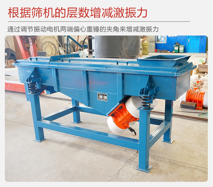5、用戶可根據(jù)篩機(jī)的層數(shù),物料比重不同來增減篩機(jī)的激振力(通過調(diào)節(jié)振動電機(jī)兩端偏心重錘的夾角來增減激振力),使篩機(jī)達(dá)到最佳的篩分效果。