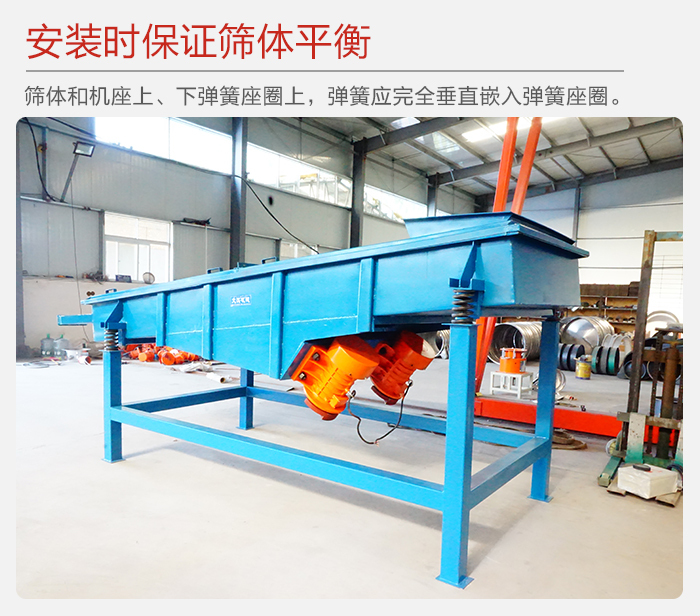 5、電機(jī)臺座:安裝振動電機(jī),使用前連接螺釘必須擰緊,特別是新篩機(jī)試用前三天、必須反復(fù)緊固,以免松動造成事故。