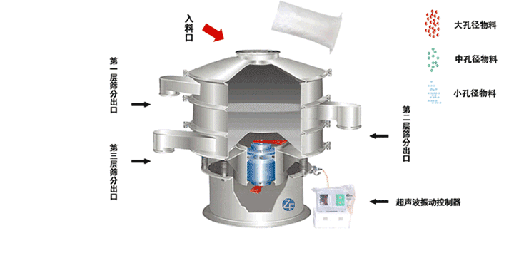 超聲波振蕩篩在直立式振動電機與超聲波換能器的共同作用下,實現(xiàn)物料的篩分/分級目的。直立式振動電機作為激振源,帶動物料和篩網的振動的同時,超聲波換能裝置實現(xiàn)對物料靜電,易聚團的抑制,保證物料的松散從而實現(xiàn)物料的篩分目的。