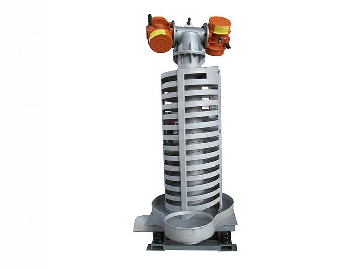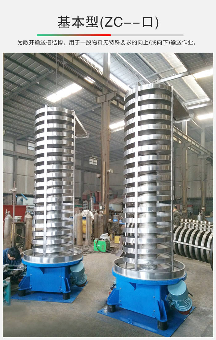 SZC系列垂直振動提升機的驅動裝置振動電機安裝在輸送塔下部,兩臺振動電機對稱交叉安裝,輸送塔由管體和焊接在管體周圍的螺旋輸送槽組成,輸送塔座于減振裝置上,減振裝置由底座和隔振彈簧組成。當垂直輸送機工作時,根據雙振動電機自同步原理,由振動電機產生激振力,強迫整個輸送塔體作水平圓運動和向上垂直運動的空間復合振動,螺旋槽內的物料則受輸送槽的作用,作勻速拋擲圓運動,沿輸送槽體向上運動,從而完成物料的向上(或向下)輸送作業(yè)。